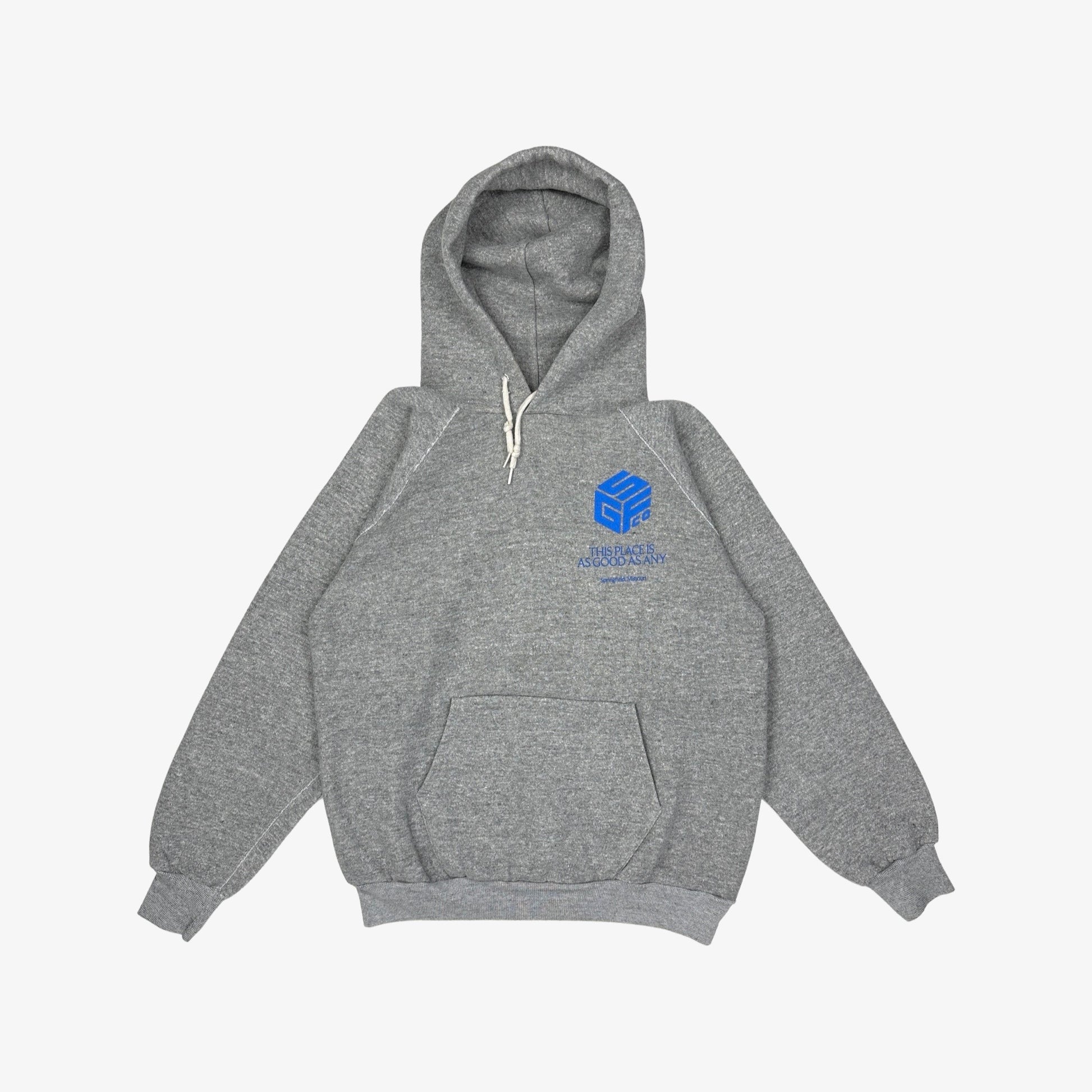 Gray made in USA hooded sweatshirt with screenprinted front. Tag reads L but fit is more like a S or M.